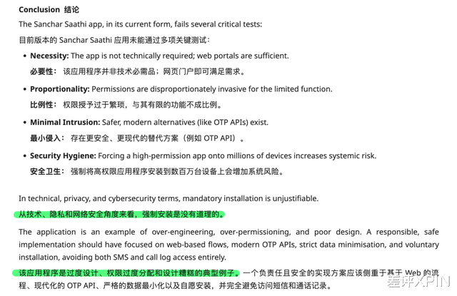 最后,sflc.in 也给出了结论,无论是技术、隐私还是网络安全,强制大家去安装 Sanchar Saathi 应用都是没有道理的,甚至还将这款应用评价为权限过度分配和设计糟糕的典型例子。